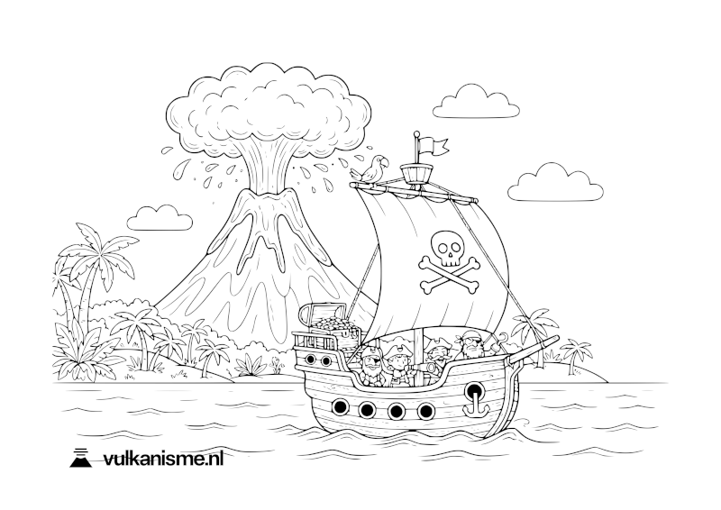 Kleurplaat: piraten vinden schat op vulkanisch eiland.